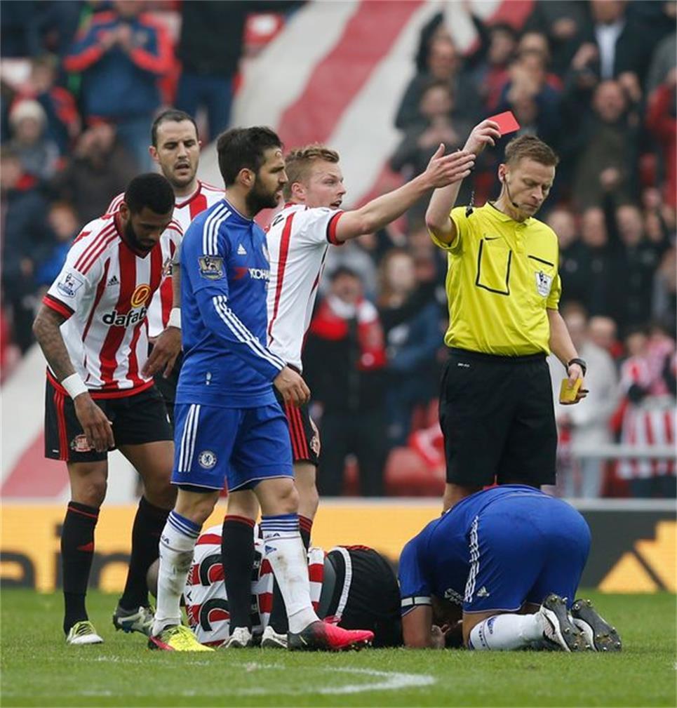 对阵桑德兰时吃到红牌的特里跪倒在地,久久不愿起身。
