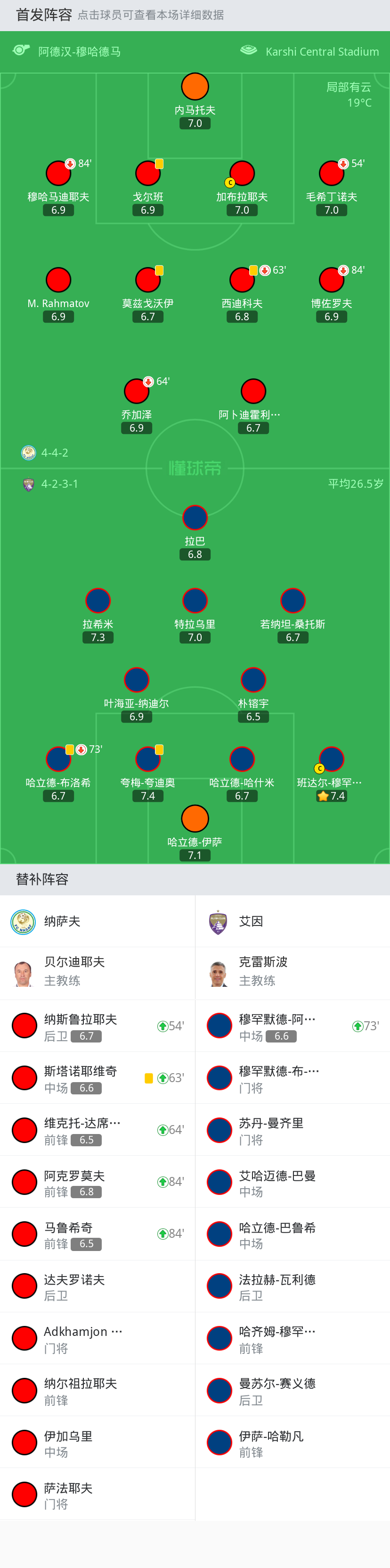 纳萨夫 首发:88-斯塔诺耶维奇, 22-戈尔班, 28-穆哈马迪耶夫, 70-伊加乌里, 30-乔加泽, 14-毛希丁诺夫, 97-阿卜迪霍利科夫, 5-加布拉耶夫, 35-内马托夫, 7-莫兹戈沃伊, 6-拉赫马托夫