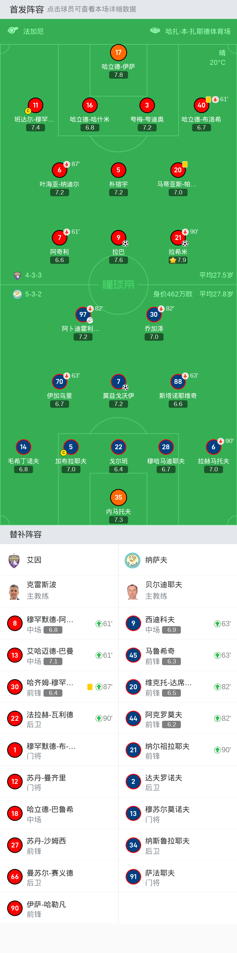 艾因 首发:17-哈立德-伊萨, 11-班达尔-穆罕默德, 9-拉巴, 5-朴镕宇, 16-哈立德-哈什米, 21-拉希米, 6-叶海亚-纳迪尔, 3-夸梅-夸迪奥, 42-若纳坦-桑托斯, 40-哈立德-布洛希, 70-特拉乌里