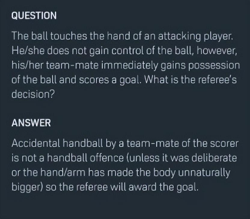 这样的新规则看上去是鼓励进攻,但依然有很多模糊的地带,也就是说唯一明确的就是,球员意外手球间接帮助队友进球或创造出进球机会,将不再被视为犯规。