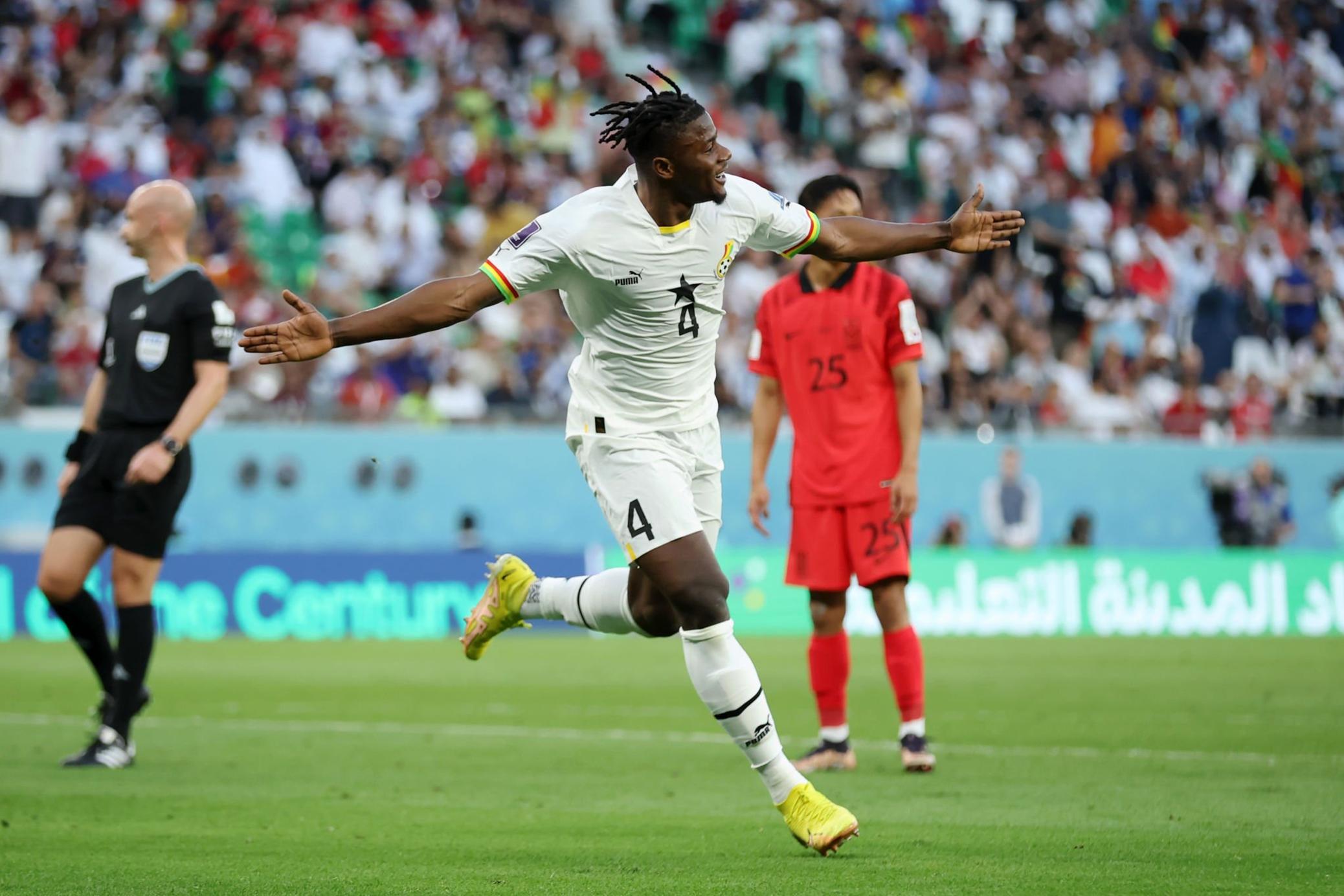 第34分钟,加纳再进1球:乔丹-阿尤将球吊入禁区,库杜斯前插,禁区内头球攻门得手,加纳2-0领先!
