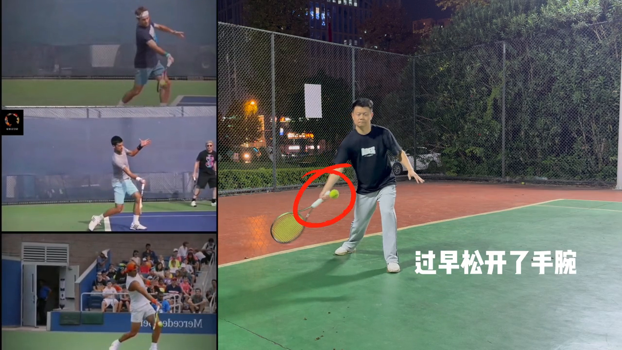 最后收拍时的小兵内旋可以更好的包裹球,控制球的方向。收拍的阶段巨头们的拍面都是朝向前方的,可是拍面朝向了侧方,挥拍轨迹还有待调整,一旦发力就非常容易出击。