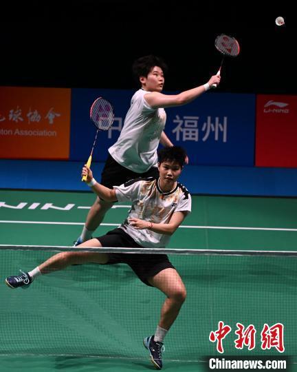 11月1日,2024年全国羽毛球团体锦标赛甲组女子团体半决赛在福州海峡奥体中心举行。最终,福建队以3比2战胜广东队进入决赛。图为福建队选手黄东萍(右)与谭宁在比赛中。中新社记者 王东明 摄