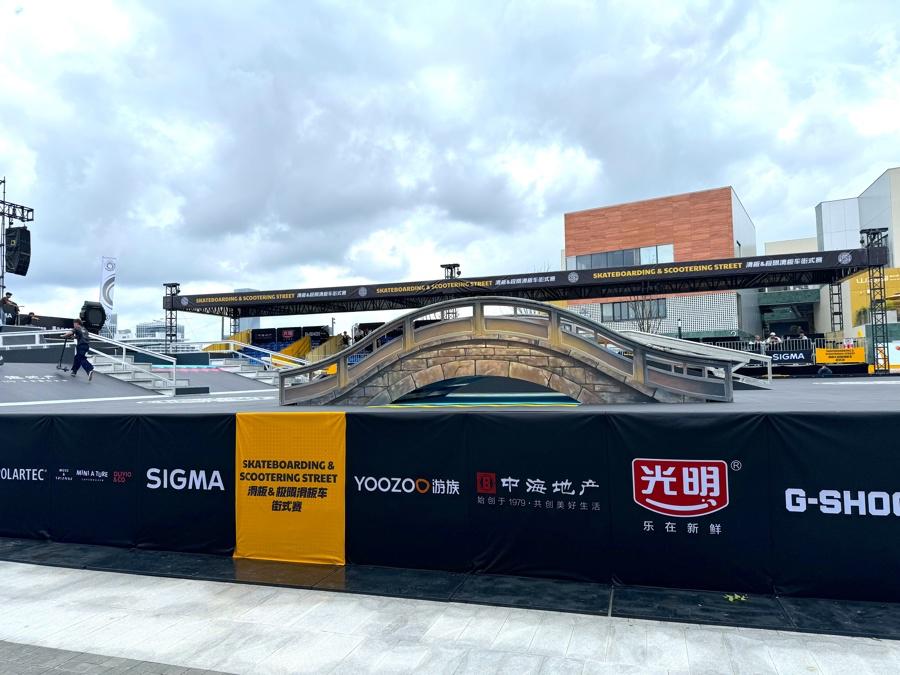 此次“FISE上海站”的场地设计师、飓风集团运动场地设计总监帕斯卡,曾参与东京奥运会、巴黎奥运会的自由式小轮车、滑板等比赛的场地设计。此次为上海设计极限运动赛事场地,他专门添加了不少中国元素,并与比赛的竞技需求相融合。例如,街式赛场地本就必备的拱形弧度被设计成了中式拱桥的形态,并且绘制成了砖木结构的视觉效果;自由式公园场地内供选手短暂停留的高台,在背景处设置了形如传统中式宅邸的“大红门”元素。