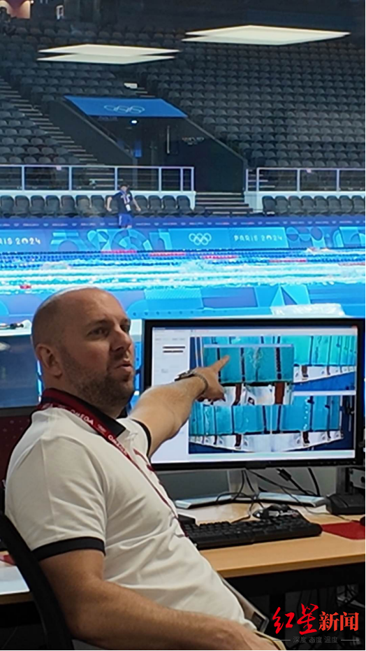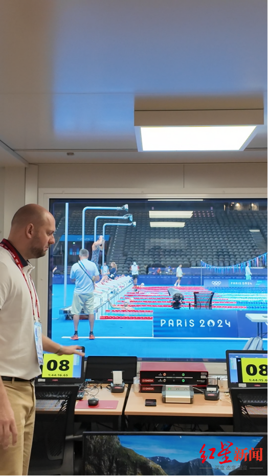 除了在赛池旁边感受巴黎奥运会的氛围外,工作人员还将记者带到了赛池旁边的计时工作间。在这里所有的系统都有双份,分别承担主机与备份机的功能,以确保计时工作运转正常。此外,现场架设的多台高点位摄像机,能够将整个泳池动态记录。当存在到边选手时间极为接近的情况时,高速慢放的设备将为所有通过转播观看比赛的受众,带来最准确、直观的视觉感受。