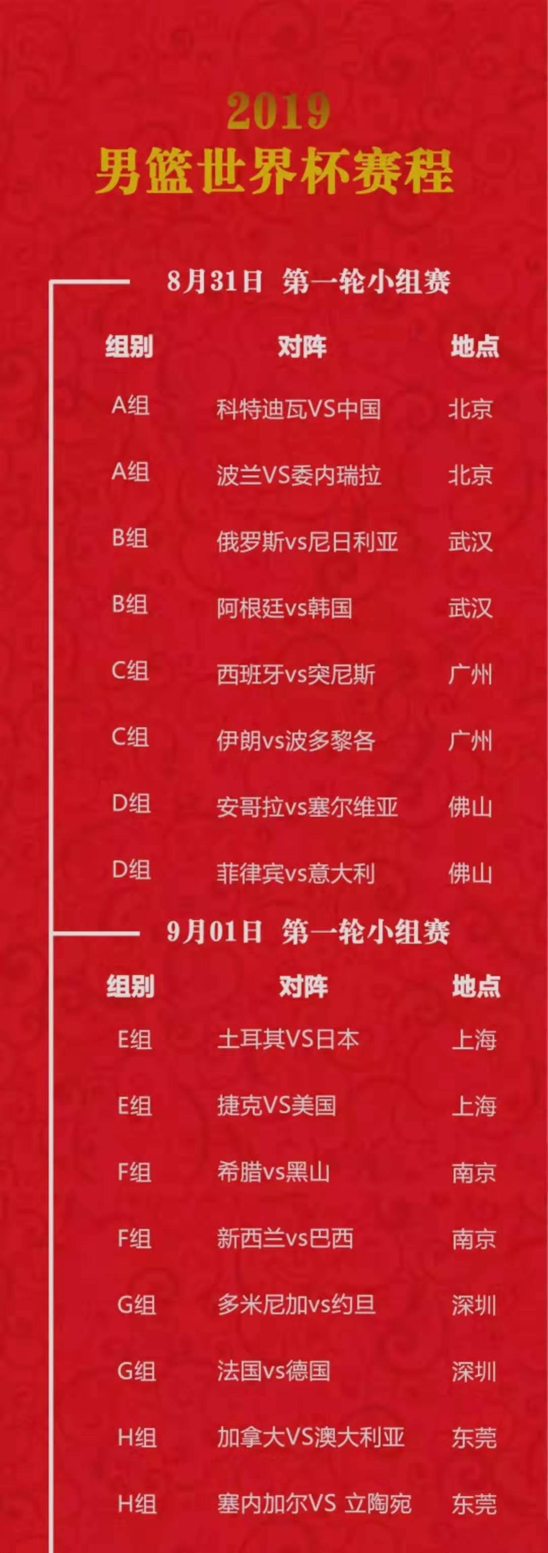 根据赛程安排,中国男篮坐镇北京主场,将与委内瑞拉、波兰和科特迪瓦争夺出线机会;而美国队作为第一种子被分在E组,与土耳其、捷克和日本在上海展开小组争夺。
