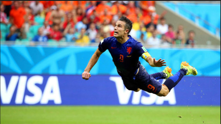 14年巴西世界杯,荷兰VS西班牙,范佩西在奔跑中,背身接队友40米长传,用一个锦鲤般的鱼跃飞行,攻破了卡西把守的大门。