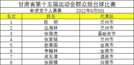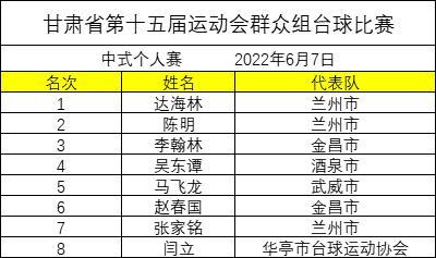 根据统计,在为期4天的群众组台球比赛中,兰州市代表队获得2金2银、平凉市代表队获得1金、酒泉市代表队1银、金昌市1铜、华亭市台球运动协会代表队1铜、嘉峪关市1铜。