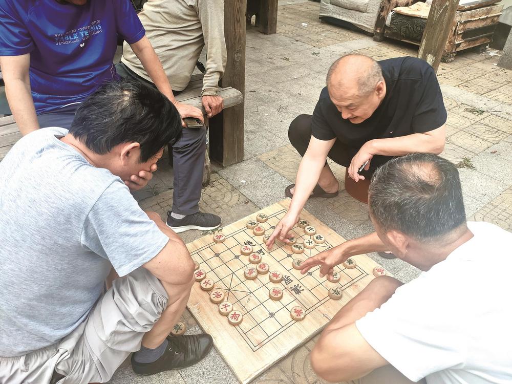 “下这儿,吃你的‘马’”“嘿嘿,再吃了你的‘炮’!”丰逸小区小广场的树荫下,围着三五个人,胡广庆的声音从里面传出,他又在下象棋了。挤进人群中,只见他双手叉腰,两只眼睛聚精会神,似乎想从棋盘上的僵局找到突破口。