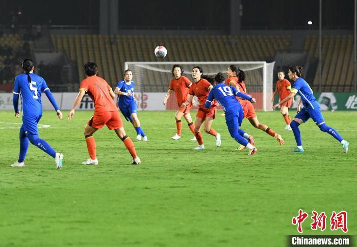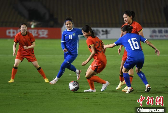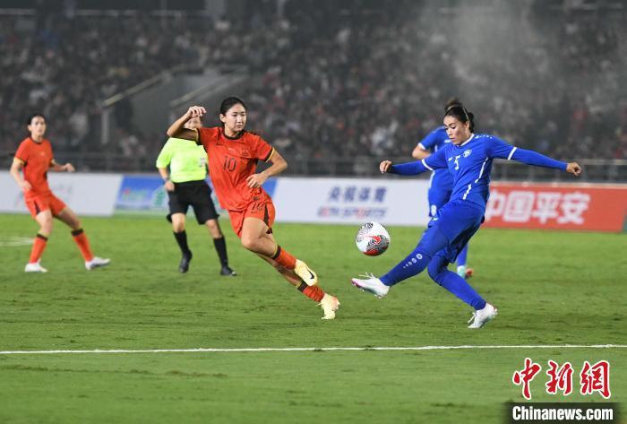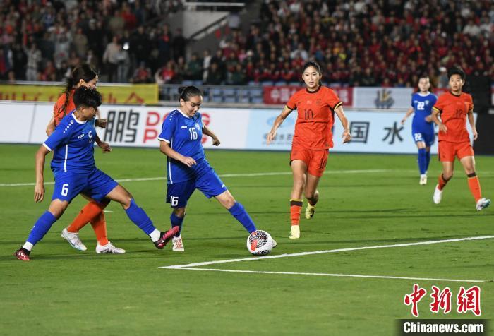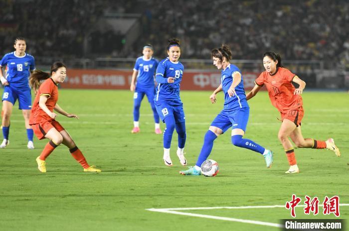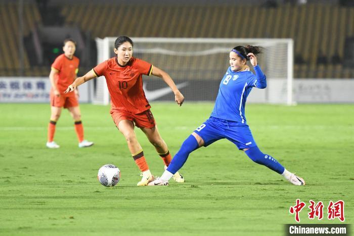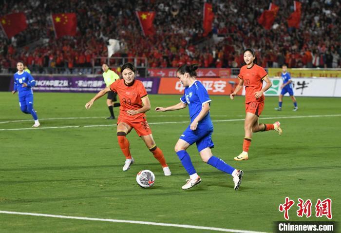 10月26日晚,中国国家女子足球队(红色球衣)在重庆永川以3:0的比分战胜乌兹别克斯坦国家女子足球队(蓝色球衣),获得2024永川国际女足锦标赛首胜。图为比赛现场。中新社记者 周毅 摄