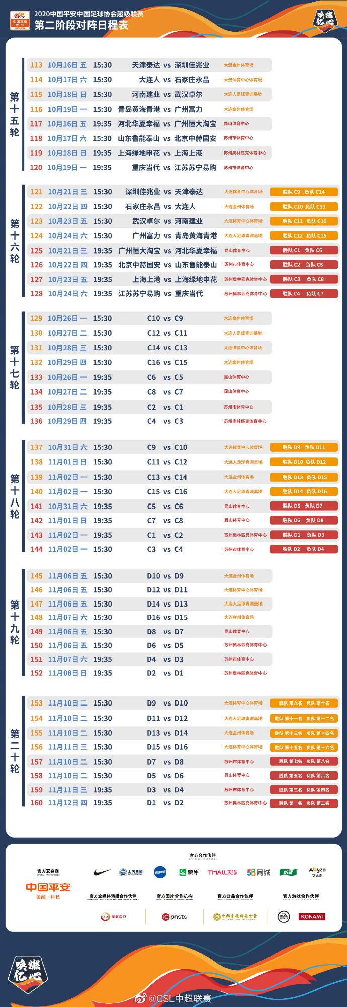 北京时间10月10日晚,中超官方发布公告:2020中国平安中国足球协会超级联赛第二阶段将于10月16日在苏州、大连两大赛区正式打响,本阶段共分6轮展开,11月12日决战收官,详细日程如下: