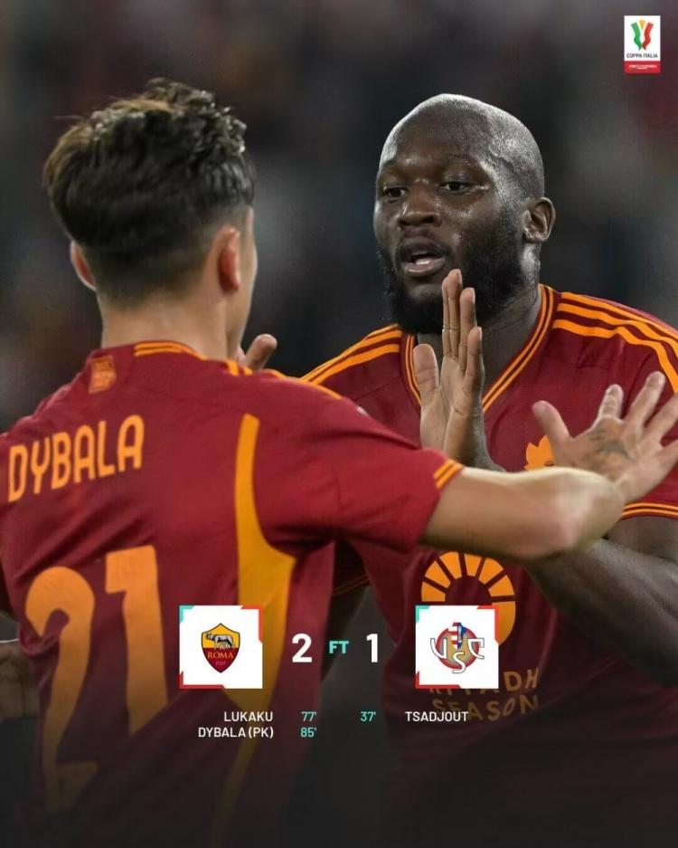直播吧1月4日讯 北京时间1月4日凌晨4点整,2023-24赛季意大利杯第3轮在罗马奥林匹克球场展开角逐,罗马坐镇主场迎战克雷莫纳。上半场佩莱格里尼中框,萨朱打破僵局,下半场沙拉维中柱&失空门,卢卡库失良机后扳平,斯皮替补造点,迪巴拉点射制胜。最终罗马主场2-1逆转克雷莫纳晋级8强,罗马下轮意杯将对阵拉齐奥。