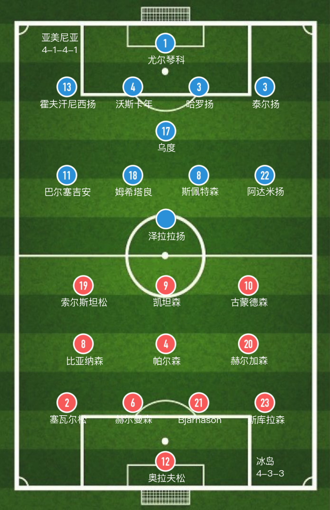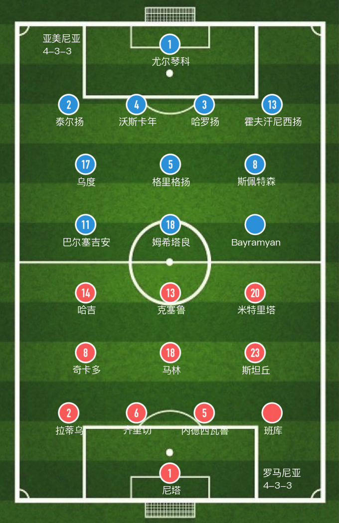 亚美尼亚(4-1-4-1): 尤尔琴科,霍夫汗尼西扬,沃斯卡年,哈罗扬,泰尔扬,乌度,巴尔塞吉安(87' 格洛延),姆希塔良,斯佩特森(78' 格里格扬),阿达米扬(78' 卡拉佩蒂安),泽拉拉扬(64' Bayramyan)