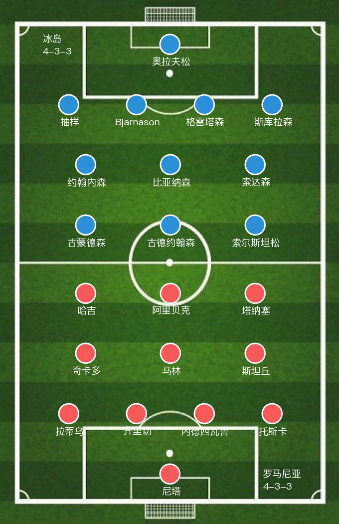 冰岛(4-3-3): 奥拉夫松,塞瓦尔松,赫尔曼森(68' 古德约翰森),Bjarnason(46' 格雷塔森),斯库拉森,比亚纳森,帕尔森,赫尔加森(90' 埃勒森),索尔斯坦松(81' 安德森),凯坦森(46' 约翰内森),古蒙德森
