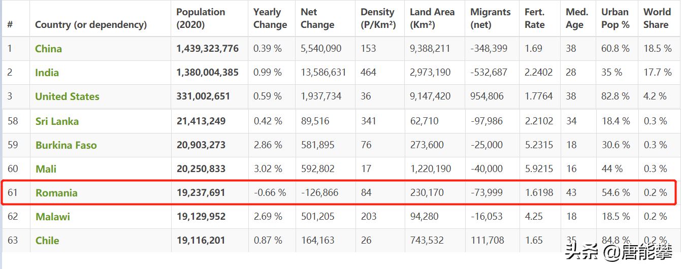 罗马尼亚人口密度64人每平方公里,不到我国153人每平方公里的一半(42%)。对比我国广西的人口4960万,罗马尼亚与广西面积基本相当,人口只有广西的39%,而广西地形多山,在我国并不算人口特别密集的区域。