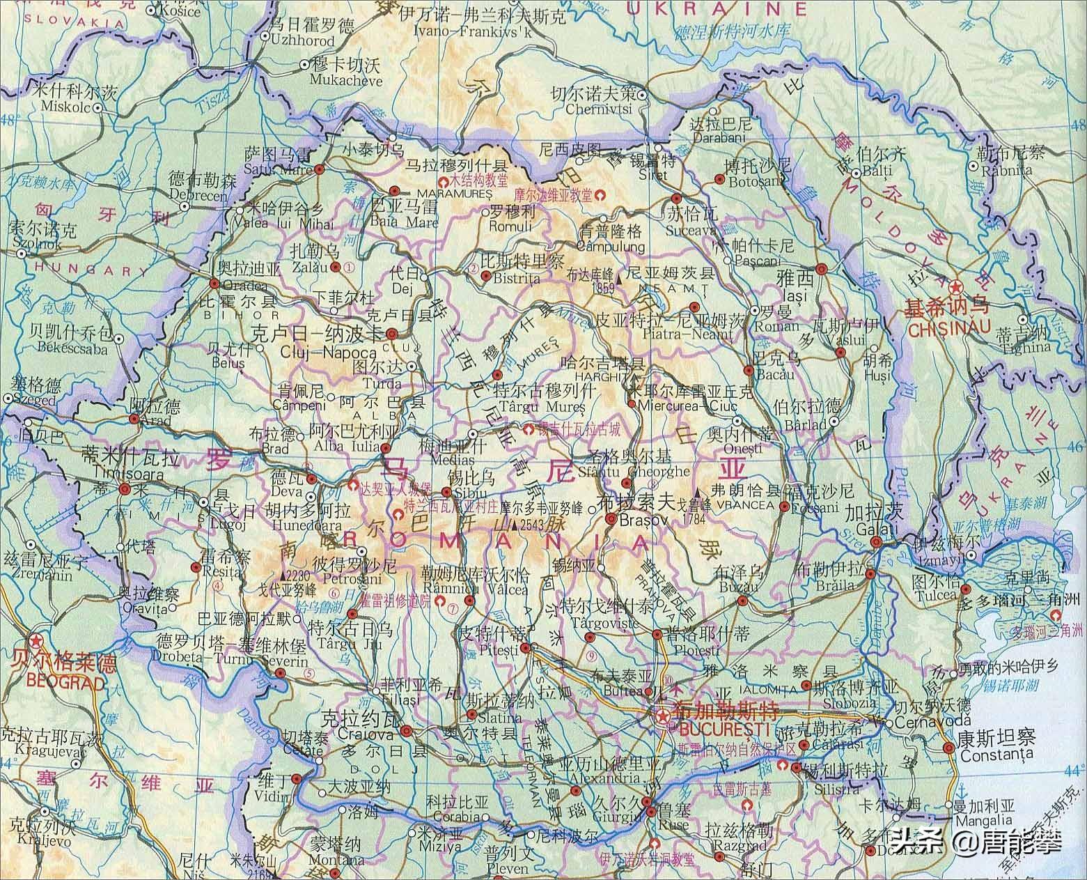 罗马尼亚平原、山地、丘陵各占国土面积的三分之一。蓝色的多瑙河、雄奇的喀尔巴阡山和绚丽多姿的黑海是罗马尼亚的三大国宝。喀尔巴阡山绵亘在罗40%的国土上,上图深棕色部分海拔在1000-2000米之间,主峰摩尔多韦亚努峰达到2543米,平原部分的海拔则低于100米。