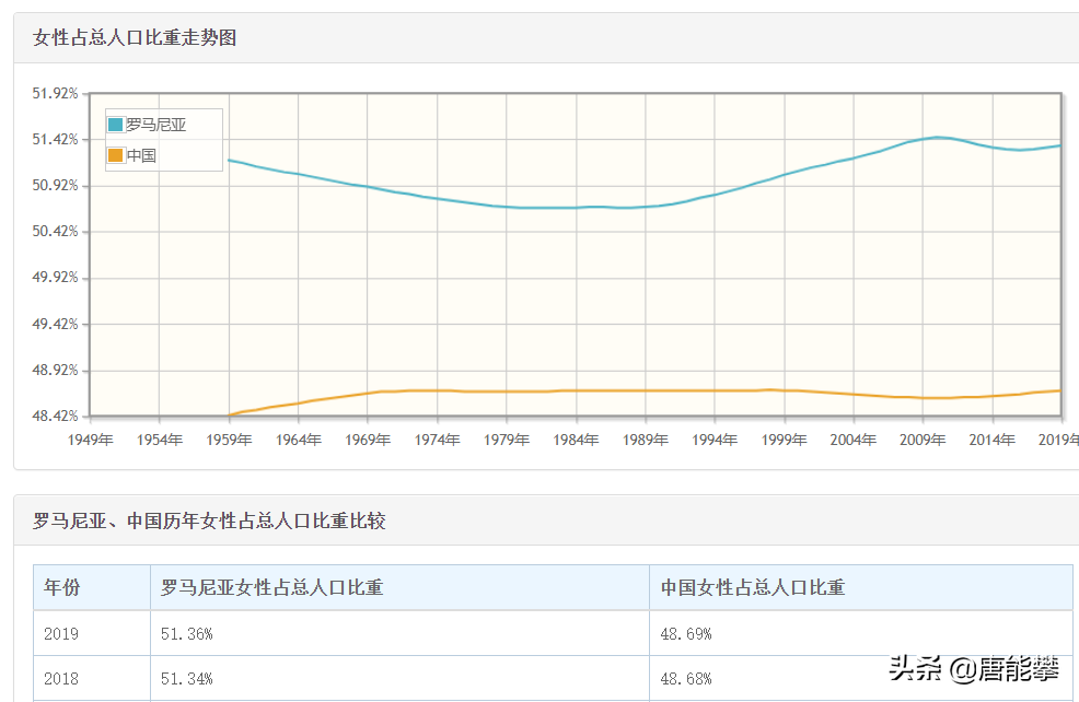 罗马尼亚的女性人口占51.36%,世界排名35位。我国是48.69%,世界第174位,倒数20位左右。