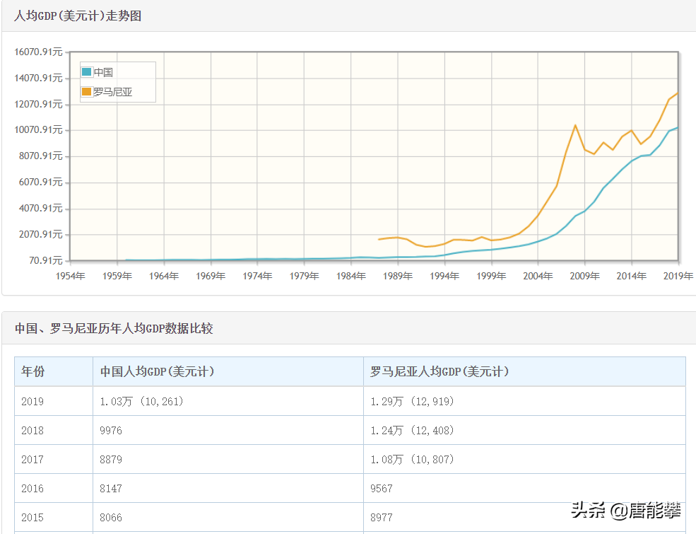 罗马尼亚2019年人均GDP大约为1.29万美元,比我国高25%。