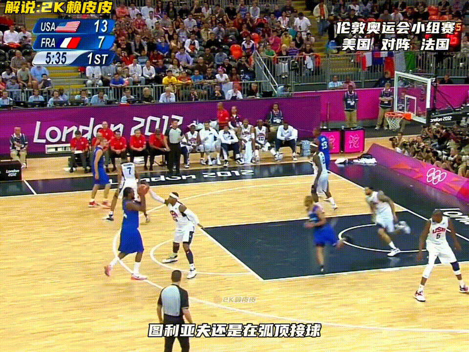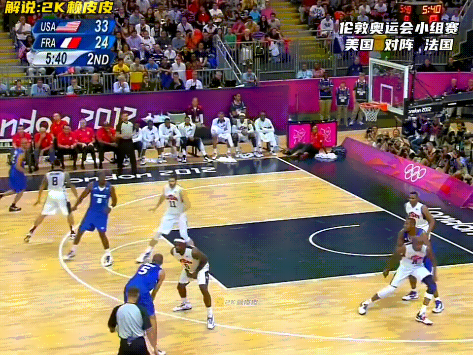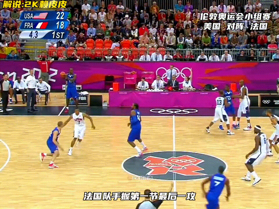 这是科比参加的最后一届奥运会。欢迎收看2012年伦敦奥运会男篮小组赛,由科詹杜领衔的美国队对阵托尼帕克率领的法国队。来看美国男篮的第一攻:正面詹姆斯拿球,钱德勒做了一个假挡切入篮下造成犯规。2+1打进。法国队这边巴图姆兜出来,队友没有及时的出球出现了失误。克里斯保罗助攻凯文杜兰特举火烧天,单手劈扣。