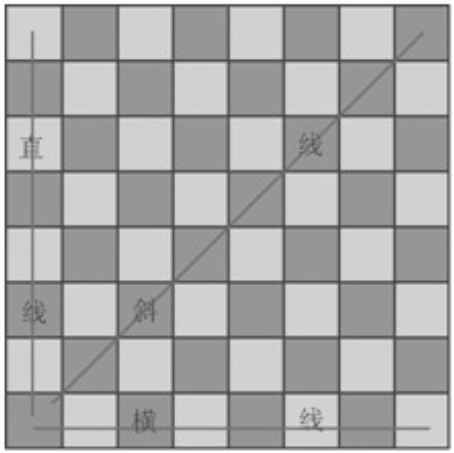 黑白64个方格构成的棋盘上,共有8条直线、8条横线以及26条由不同颜色组成的斜线。如下图。