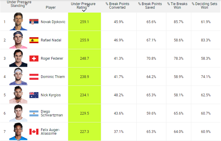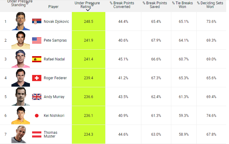 据统计,从开始数据采集至今,面临压力时表现最佳的仍是德约科维奇,他的“面临压力的评级分”为248.5分,其后分别是桑普拉斯(241.9分)、纳达尔(241.4分)、费德勒(239.4分)、穆雷(236.6分)、锦织圭(236.1分)、奥地利名宿托马斯·穆斯特(234.3分)。