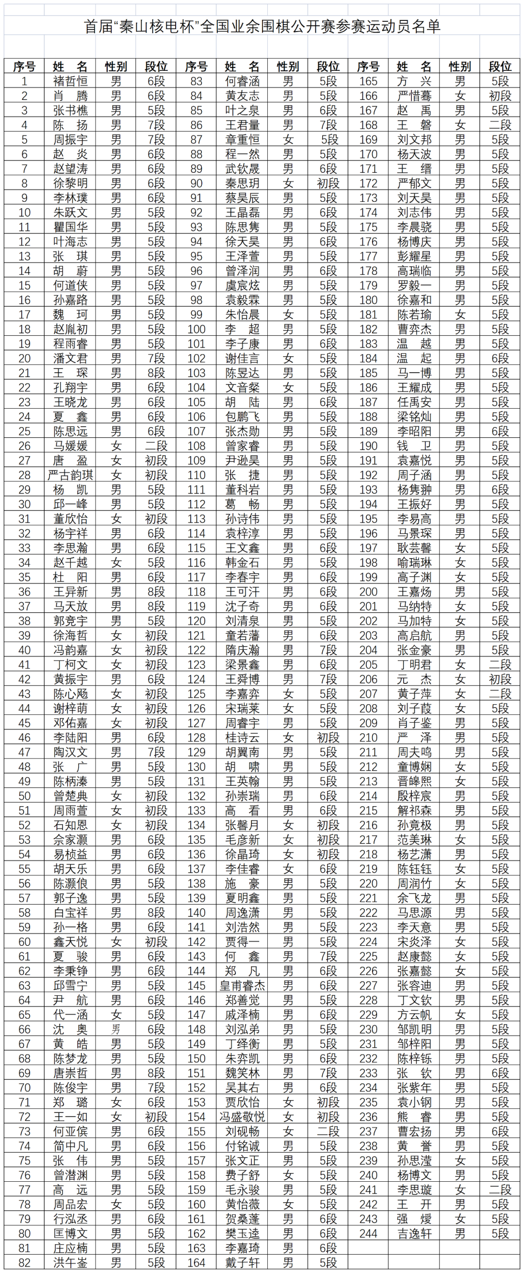 2022年开始中国围棋协会增设了业余8段,把业6办赛权放至省一级。去年受疫情影响各地办的“升6赛”还不算多,今年开始逐步恢复,业6井喷的时代即将来临。原来想升到业余6段需要参加全国级的业余赛事并名列前茅,难度与省赛不可同日而语,不妨先看看今年首项全国业余围棋公开赛“秦山核电杯”报名情况——