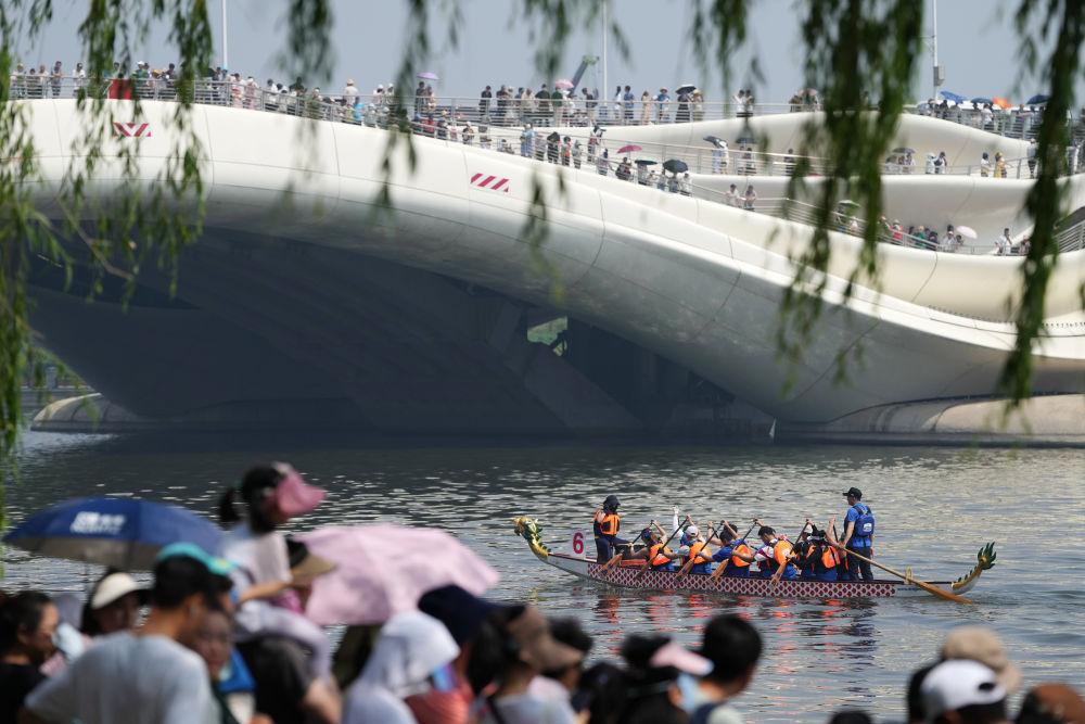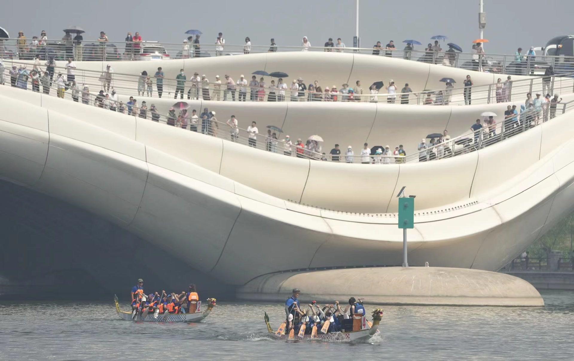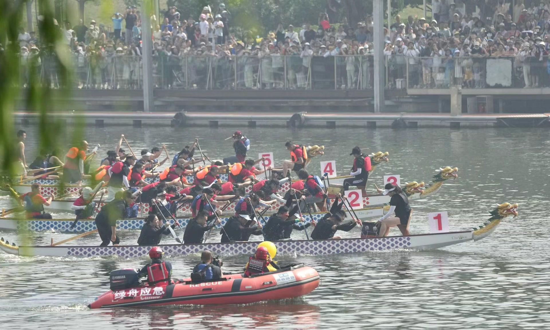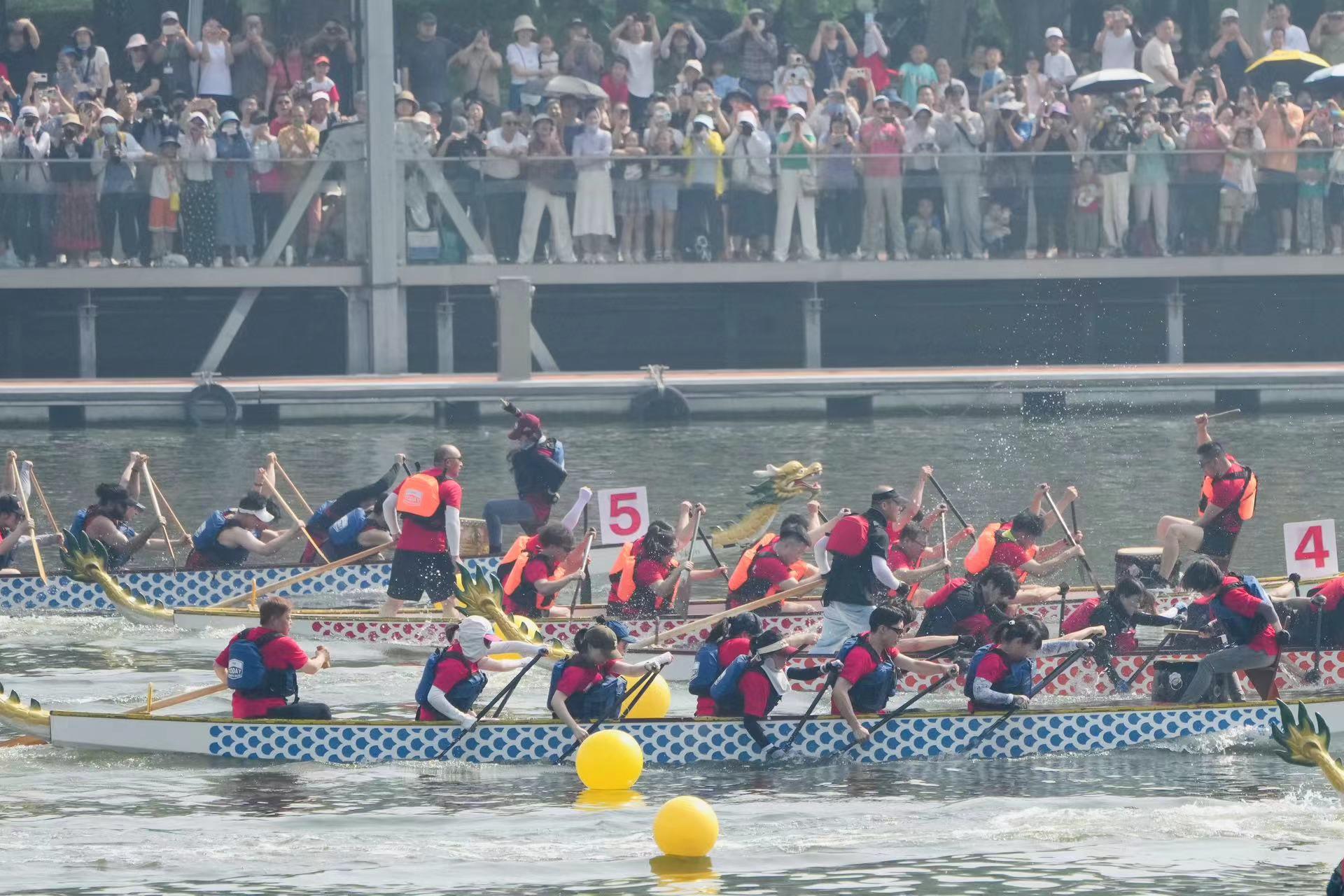 本次大赛由北京市社会体育管理中心等单位主办,竞赛项目为混合组200米直道竞速赛,分为预赛和决赛两个阶段。随着嘹亮的笛响划破天际,同组五条龙舟齐发。选手们在昂扬的鼓点和观赛群众的助威声中劈波斩浪,奋勇争先。据了解,比赛同时,赛事相关话题已冲上主流社交平台北京地区的热搜榜首。“近年来,龙舟在北京愈发受到健身群众欢迎。希望我们的比赛,在丰富人民群众端午假期生活的同时,也能够助力祖国传统文化和民族传统体育项目在北方地区发扬光大。”市社体中心主任孔宪菲说,“不少市民携家带口,一大早儿赶到通州来,在早点摊吃个烧饼夹肉,然后到大运河畔观看比赛、参与文化活动。大赛不仅是选手的竞技场,更丰富了市民的端午假期文化娱乐生活,同时促进了当地消费。”