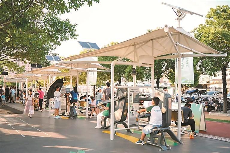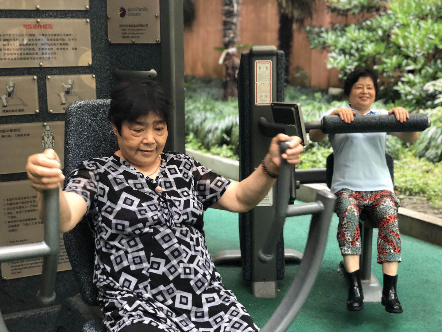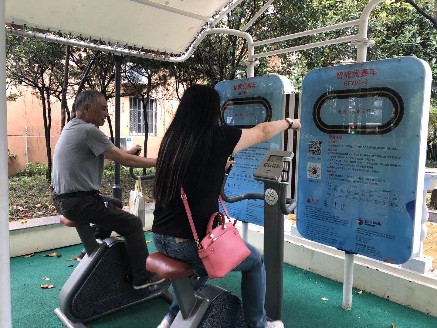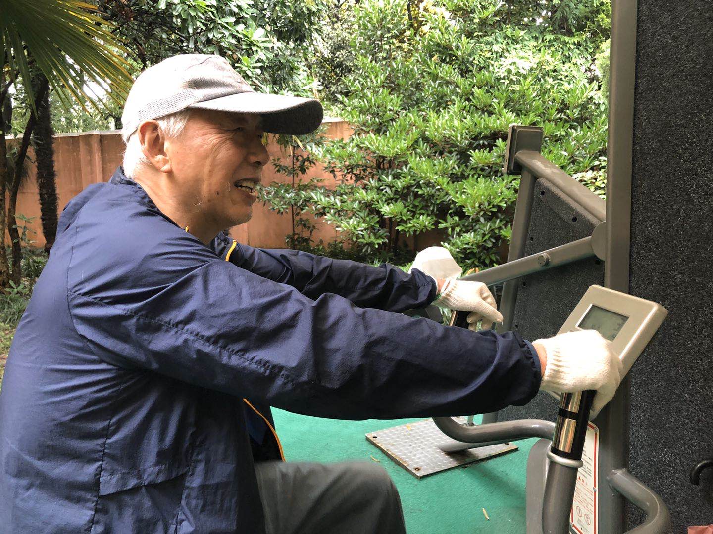 “下雨天我就在这个有顶棚的地方活动,这里有4种可以锻炼身体不同部位的运动项目。”说着,他熟练地按下阻力调节键踩起健身车,“等屏幕显示运动了10分钟,我就下来换一样,每天玩三个项目回家。”