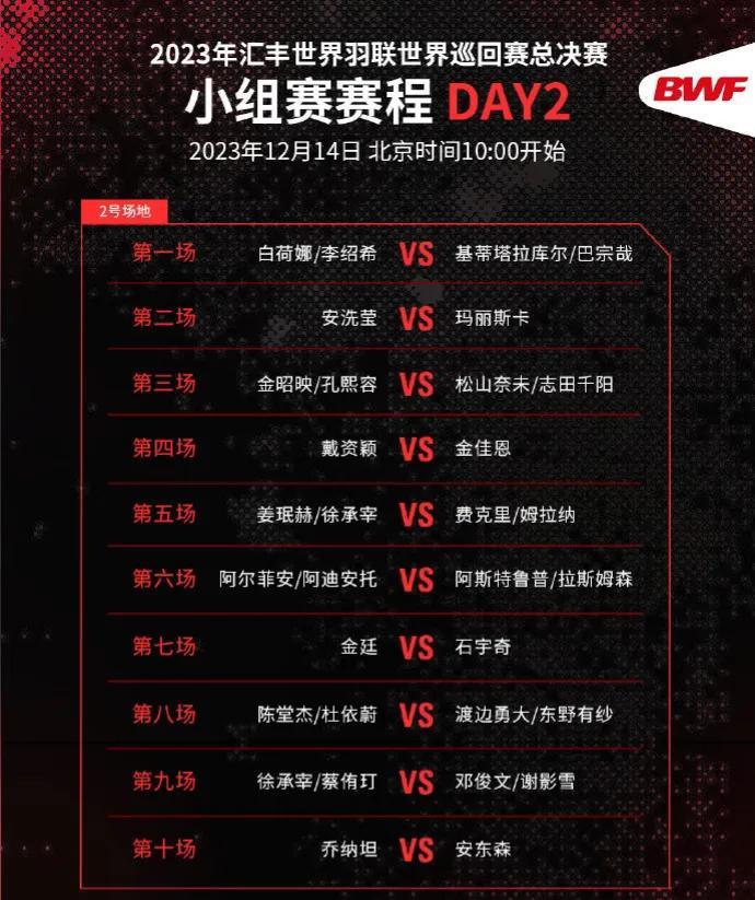 北京时间12月14日,2023年世界羽联年终总决赛小组赛。今日的比赛分为上午10点和下午5点两场,为体育爱好者提供了一整天的精彩纷对决,今日中国选手无内战,以下将带来中国选手比赛赛程。