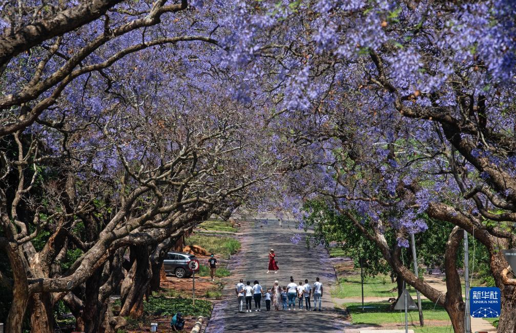 2020年10月17日,南非比勒陀利亚盛开的蓝花楹吸引游客前来拍照打卡。