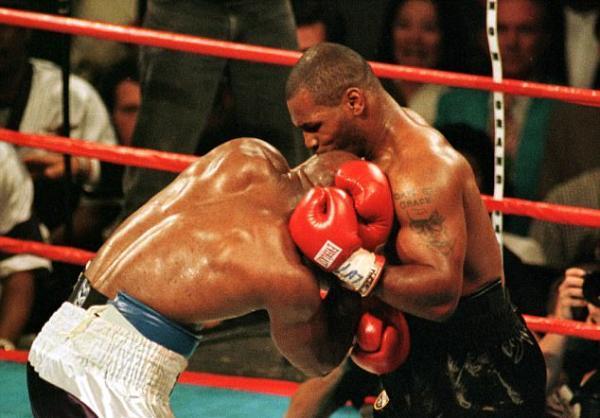 1997年两人的二番战中,泰森不堪忍受霍利菲尔德的搂抱加头顶,狠狠咬了对手的耳朵,导致比赛在两个回合后戛然而止。