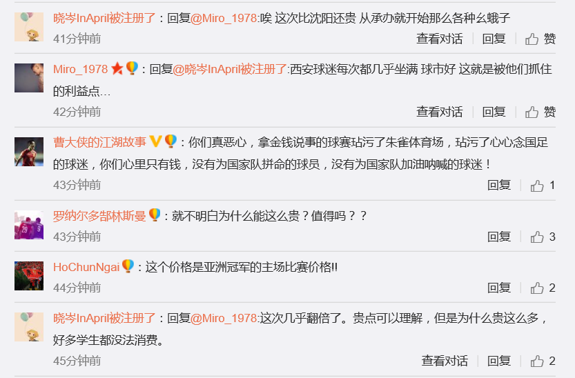 在看到如此高的票价后,西安球迷认为被宰:“这一价格比之前高了一倍。之前300的位置现在卖580。”有学生党吐槽:“国足比赛再也看不起。”