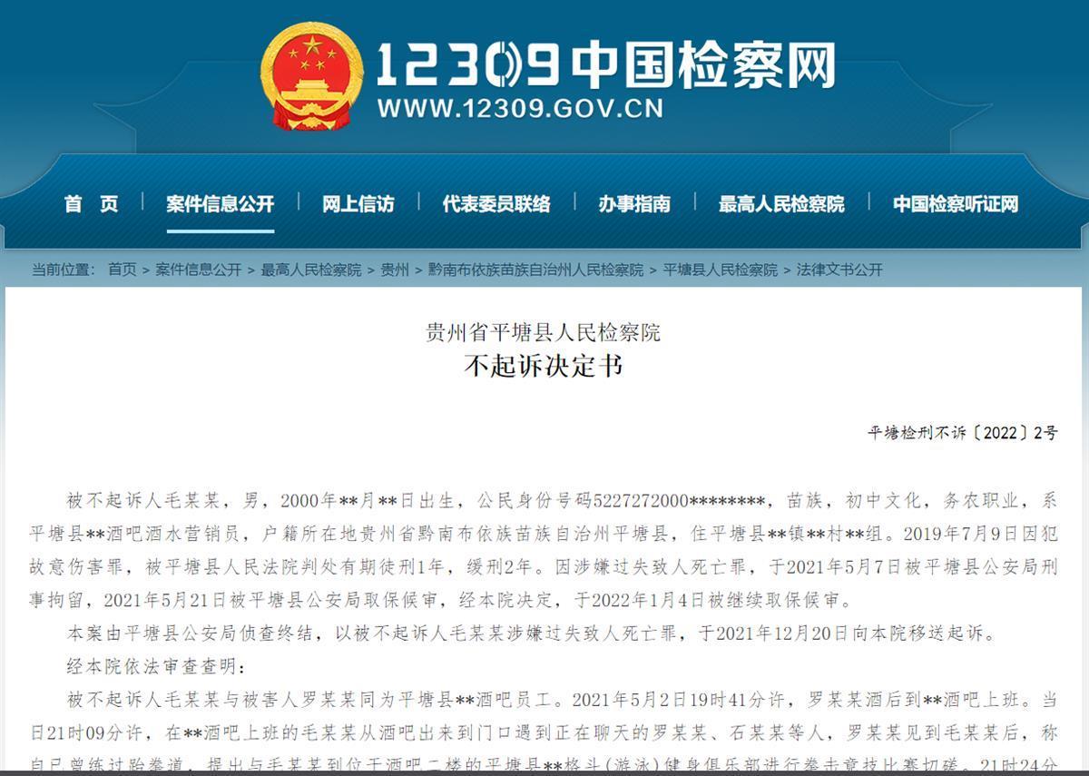 贵州一男子酒后主动邀请朋友进行拳击比赛,结果却被打伤致死。1月21日,极目新闻记者获悉,检方认为该男子应自行承担风险和后果,比赛中对手没有存在故意或者过失,因此不构成犯罪,于1月17日作出不起诉决定。