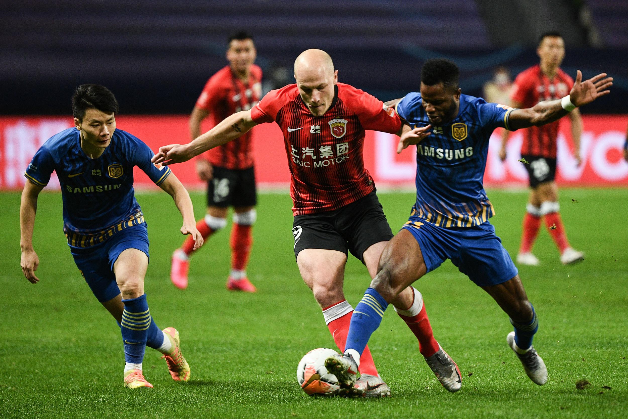 苏宁球员夹击上港澳大利亚国脚穆伊。