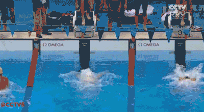 △ 男4×100混接中国队犯规瞬间:在第二棒李响到边之前,第三棒李朱濠有点着急,提前跃进泳池。