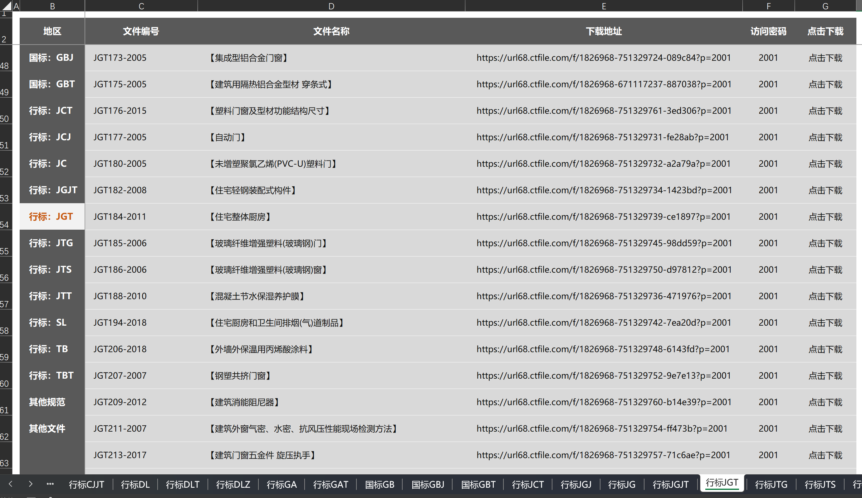 这是目前收集到的行标JGT系列,不知道有没有少的,希望大家留言,我好补全。已经把所有资料打包成了Excel文件,顺便制作了一个可以查询的功能,WPS用起来还是比较不友好,所以如果需要,私信留邮箱,所有的下载密码都是:2001,目前总共收录了9823份文件,希望可以帮到大家