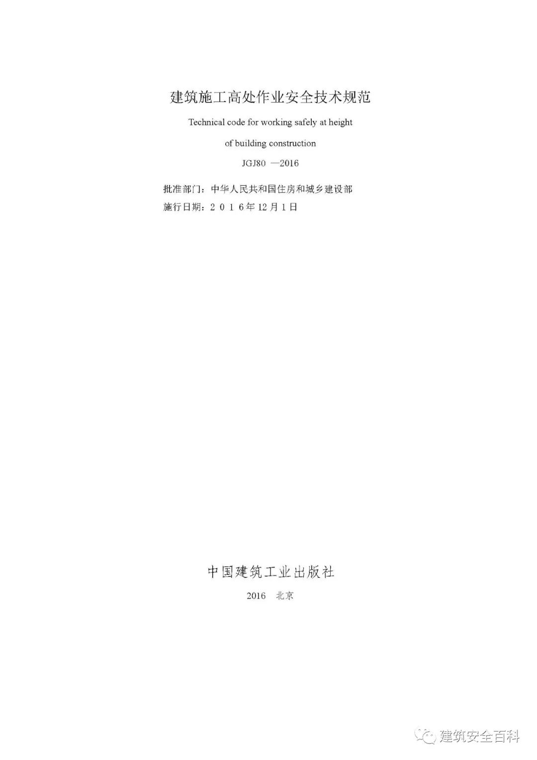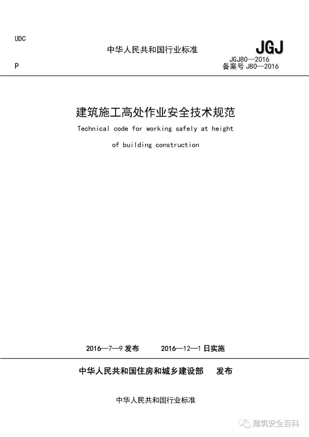 JGJ 80-2016 建筑施工高处作业安全技术规范。为提升建筑施工高处作业的安全水平,做到防护安全、技术完进、经济合理,特制定本规范。