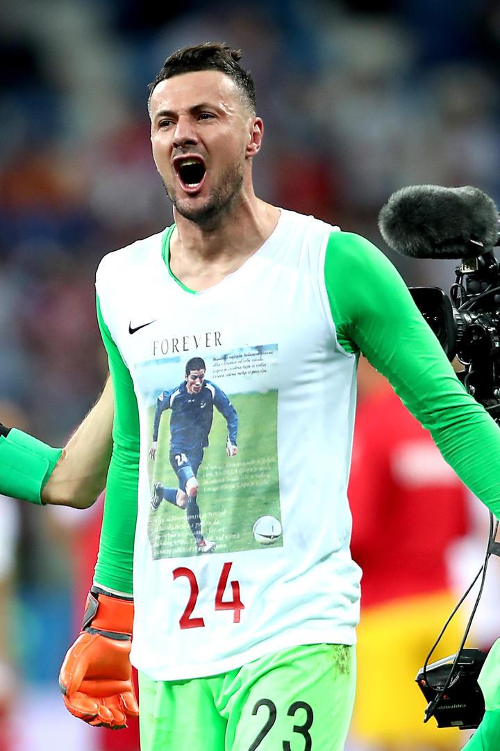 俄罗斯队第一个出场的斯莫洛夫的点球被苏巴西奇判断准确单掌击出,此外在他强大的气场震慑下,俄罗斯队的费尔南德斯也罚失了点球。加上一场淘汰丹麦队苏巴西奇扑出的3个点球,苏巴西奇本届世界杯已经扑出了4个点球,连续两场点球大战立功,格子军时隔20年再次挺进世界杯四强。苏巴西奇还是一位很重情义的男人,每逢参加重大比赛,苏巴西奇都会穿上一件特殊的T恤,上面印有10年前意外去世的好友赫尔沃伊的照片,并且写着此生永远相伴。