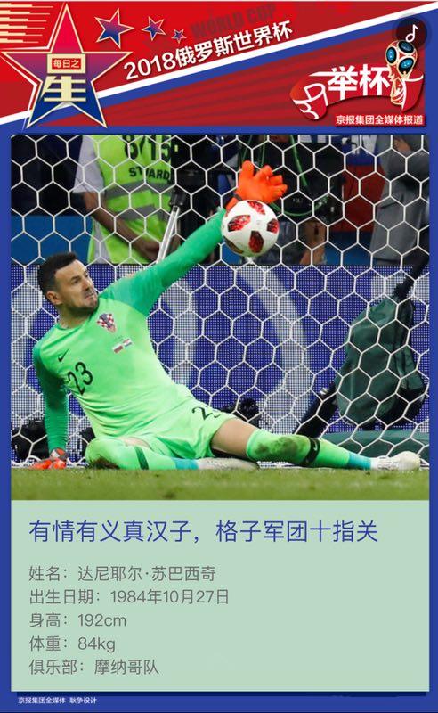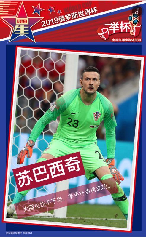 大腿拉伤不下场,单手扑点再立功。有情有义真汉子,格子军团十指关。尽管比赛中大腿肌肉拉伤,但顽强的克罗地亚门神苏巴西奇不仅带伤打完了加时赛,还在点球大战中扑出斯莫洛夫的点球,帮助球队战击败东道主俄罗斯队,杀入四强。比赛第89分钟,苏巴西奇完成一次扑救后大腿肌肉拉伤,倒在场上用手捶打草皮。在队医进场简短治疗后,苏巴西奇一瘸一拐重新投入比赛。用完了所有换人名额的克罗地亚队无法再给苏巴西奇腾出一个换人名额,33岁的门将只能带伤继续打完30分钟的加时赛。即便如此,他在加时赛中扑出了库兹亚耶夫的射门,并化解了斯莫洛夫的传中威胁。点球大战中有了苏巴西奇的坐镇,克罗地亚最终获胜。