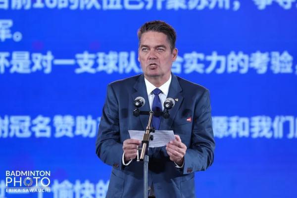 世界羽联主席保罗·埃里克·霍耶代表世界羽联对本届苏迪曼杯在苏州顺利开幕表示祝贺,对苏州在赛事筹备过程中付出的努力表示感谢。霍耶表示,这三年世界羽联一直热切地等待中国举办国际赛事,如今能够回到中国参加苏迪曼杯感到非常开心。苏迪曼杯是对一支球队综合实力的考验,世界排名前16的队伍已齐聚苏州,争夺本届世界混合团体锦标赛的冠军,祝愿所有队伍都能够取得优秀成绩。