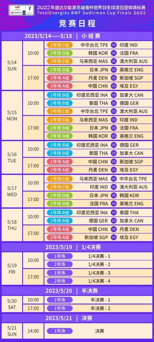 2023苏杯出场顺序?回答如下:苏迪曼杯规定了6种比赛顺序:1、男双、女单、男单、女双、混双2、男单、女单、男双、女双、混双3、混双、男单、男双、女单、女双4、混双、男单...