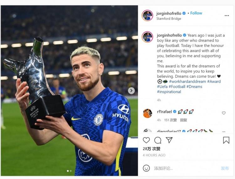 若日尼奥写道:“多年前,我只是一个怀揣着足球梦想的少年,就像其他许多人一样。而今天,我很荣幸能和你们所有人一起庆祝获得这个奖项,你们一直相信我,支持我。”