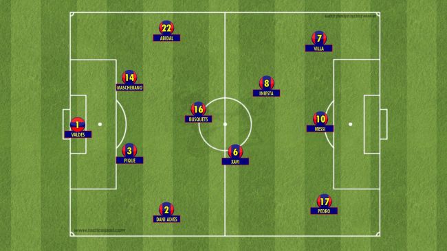 在进攻时,巴萨的阵型变为了与今天曼城一样的2-3-5,不过并不完全相同。当时的巴萨两个中卫坐镇后场,右边后卫阿尔维斯直接助攻到对方防守三区之前,当成边锋来用;左侧如果上马克斯维尔的话,也可以达到同样的效果,可他并不是首发左后卫。在这个位置上,首发的阿比达尔并不是助攻型的边后卫,因此在进攻时,阿比达尔补到中场的位置,而盘带和过人脚法出色的伊涅斯塔,可以出现在左边锋的位置上。