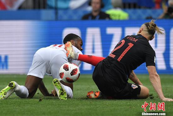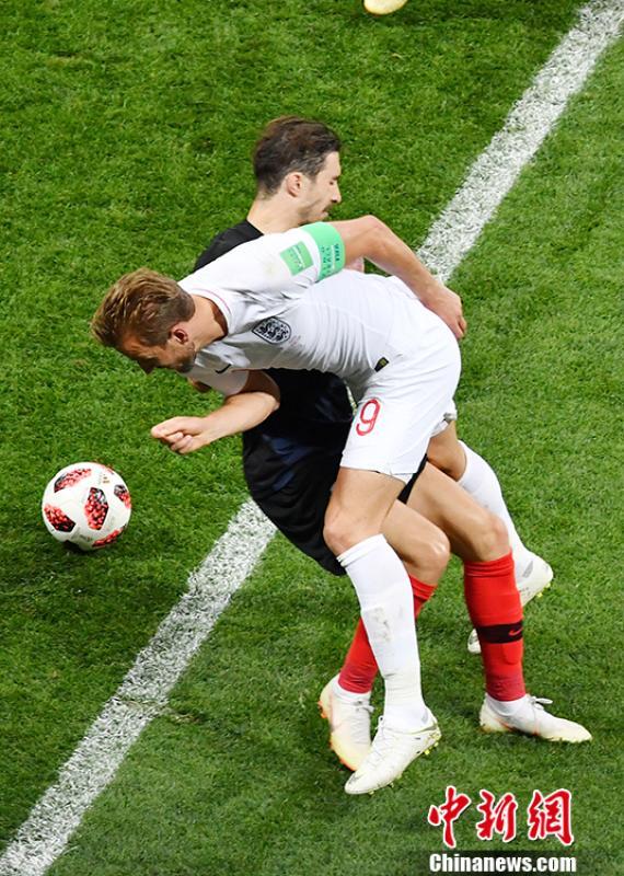 俄罗斯世界杯半决赛,克罗地亚对阵英格兰。图为双方争抢足球。中新社记者 田博川 摄