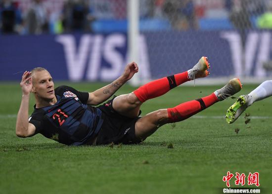 此后,双方均无建树,比分最终锁定在了2:1,克罗地亚逆转淘汰英格兰队挺进决赛,他们将与法国队争夺大力神杯。图为维达倒地。 中新社记者 田博川 摄
