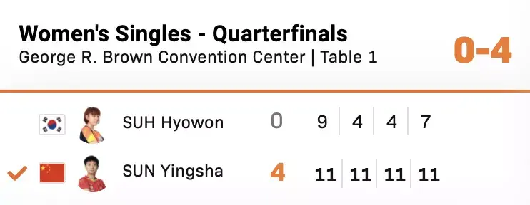 第三场女单1/4决赛,孙颖莎对阵韩国选手徐孝元。本场比赛孙颖莎发挥出色,4-0(11-9/11-4/11-4/11-7)击败对手晋级四强,半决赛孙颖莎将战王艺迪。