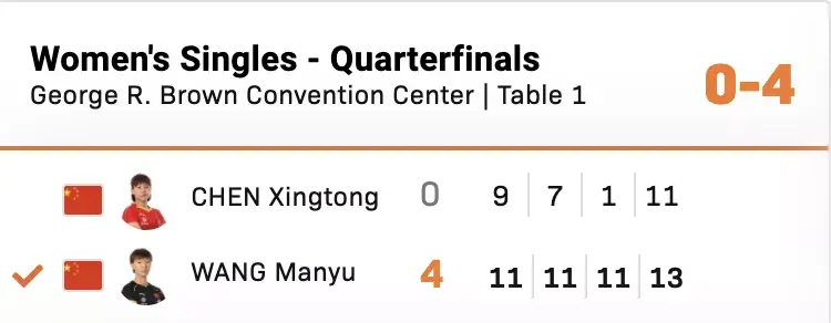 第四场女单1/4决赛,王曼昱4-0击败陈幸同,拿到最后一张四强门票。