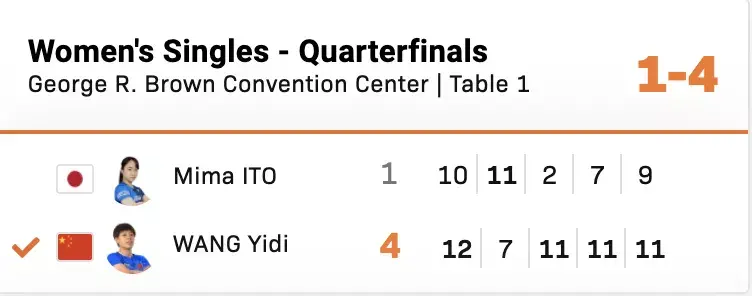 陈梦1/4决赛的对手是日本选手石川佳纯。陈梦开局慢热,随着比赛进行,陈梦及时调整状态,不急不躁连续下分。最终实力更胜一筹的陈梦,以4-0(11-9/11-6/11-8/11-6)的比分横扫石川佳纯,率先晋级女单四强。