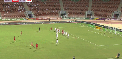 第45分钟,阿曼队开出任意球,后点回做,哈吉里禁区内爆射破门,好在越位在先进球无效。