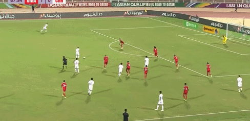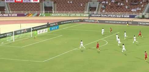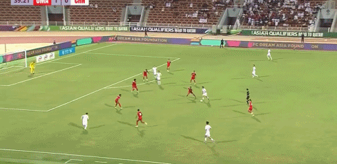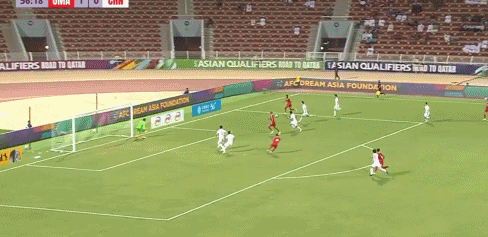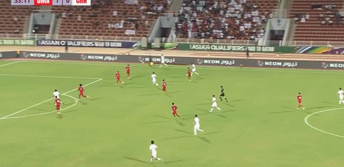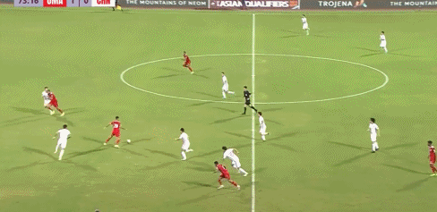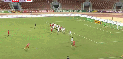 第56分钟,阿曼队右边路快速反击,局部形成2打1的套边配合,随后低平球传中形成威胁。